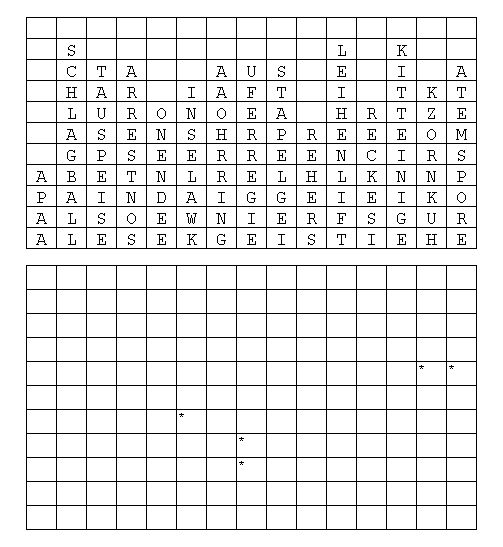 Beim Kollapsrätsel wurden in der oberen Tabelle alle Blindfelder entfernt. Dadurch sind die Buchstaben nach unten 'gefallen'. Wenn Sie das Rätsel gelöst haben, dann befinden sich in den *-Feldern die Buchstaben des Lösungswortes.