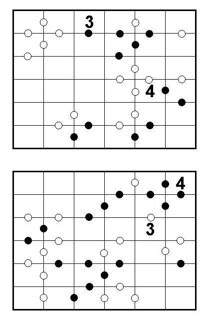 In jeder Tabelle müssen die Ziffern von 1 bis 6 so eingetragen werden, dass in jeder Spalte und jeder Zeile jede der Ziffern genau einmal vorkommt. Befindet sich zwischen zwei Feldern ein schwarzer Kreis, so muss eine der beiden Ziffern genau das Doppelte der anderen Ziffer sein. Befindet sich zwischen zwei Feldern ein weißer Kreis, so muss eine der beiden Ziffern genau un eins größer sein als die andere Ziffer. Befindet sich kein Kreis zwischen zwei Ziffern, so darf auch keine der beiden Eigenschaften zutreffen.