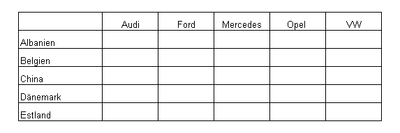 In einer Firma arbeiteten fünf Studenten aus Albanien, Belgien, China, Dänemark und Estland während ihrer Semesterferien als Fahrer. Ihnen standen als Wagen ein Audi, Ford, Mercedes, Opel und VW zur Verfügung. Die Studenten haben immer fünf Tage hintereinander Dienst. Während dieser Zeit fährt jeder der fünf Fahrer jeden der fünf Wagen. Darüber ist folgendes bekannt: