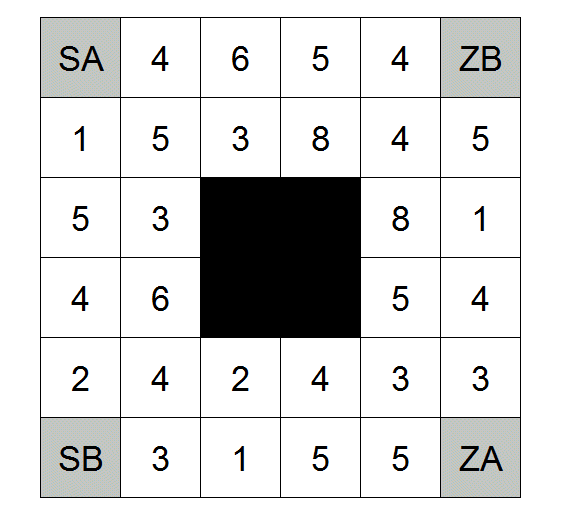 - Finden Sie die Verbindung zwischen Start A (SA) und Ziel A (ZA), für die die Summe der Wegezahlen am kleinsten ist. Achten Sie auf eine lückenlose Verbindung. Kein Feld darf zweimal betreten werden. Die Verbindung darf auch diagonal von einem Feld zum nächsten führen.