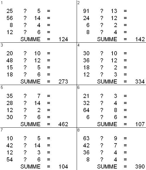 Setzen Sie in die Lücken die vier Rechenzeichen ein. Die Summe der vier Ergebnisse ist vorgegeben. Zu jeder Reihenfolge der Rechenzeichen gehört ein Lösungsbuchstabe.