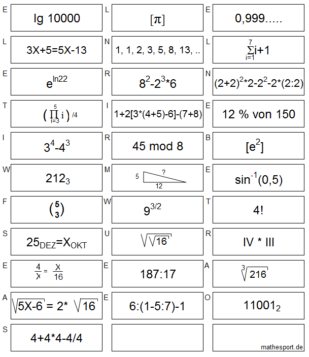 Jede Aufgabe hat als Ergebnis eine natürliche Zahl zwischen 1 und 31. Sortieren Sie die Aufgaben aufsteigend nach dem Ergebnis. Die mitsortierten Buchstaben ergeben die Namen von sechs Mathematikern. Gesucht ist der alphabetisch vierte Name.