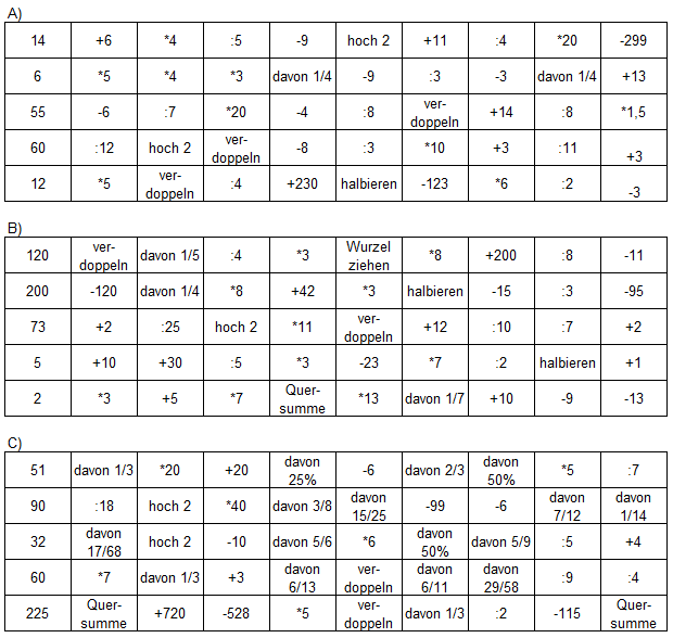 Bearbeiten Sie die folgenden Aufgaben ohne Hilfsmittel. In jeder Zeile gibt es ein Ergebnis zwischen 1 und 26. Die Zahl gibt die Position des gesuchten Buchstabens im Alphabet an. Die Buchstaben ergeben (in der richtigen Reihenfolge) die Lösungswörter.