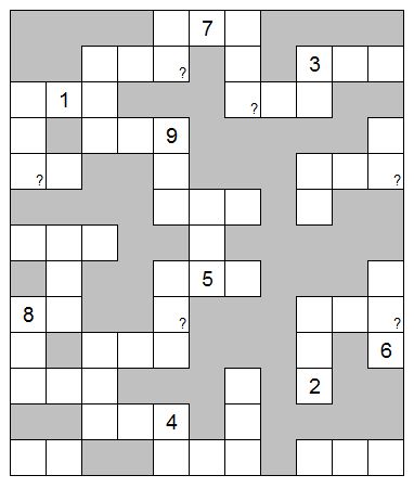 Tragen Sie in das Gitter alle zweistelligen und dreistelligen Potenzen (z.B. 25=32, 53=125, ...) ein. Nehmen Sie die Ziffern in den Fragezeichen-Feldern und wandeln Sie jede Ziffer in einen Buchstaben um (1=A, 2=B, ...). In der richtigen Reihenfolge ergeben die Buchstaben das Lösungswort.