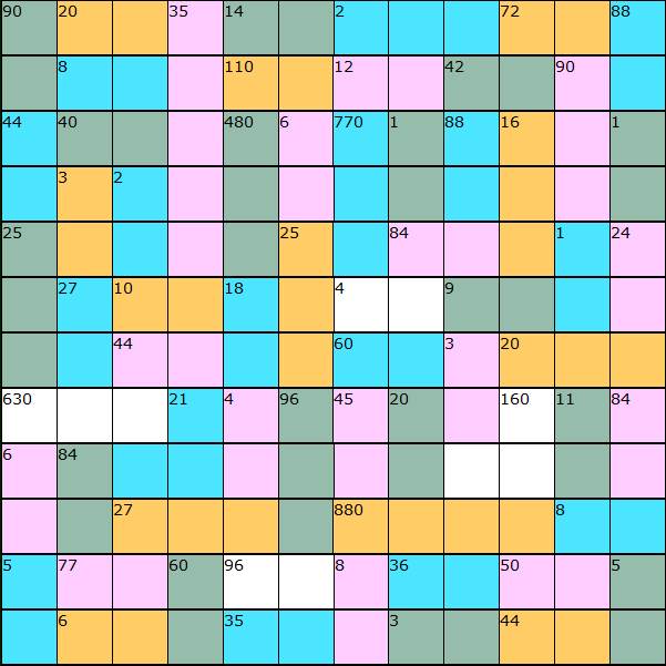 In der linken oberen Ecke einer farblichen Feldgruppe steht ein Rechenergebnis, das sich ergibt durch die Verknüpfung der Zahlen in den zugehörigen Feldern mit genau einer der Grundrechenarten.