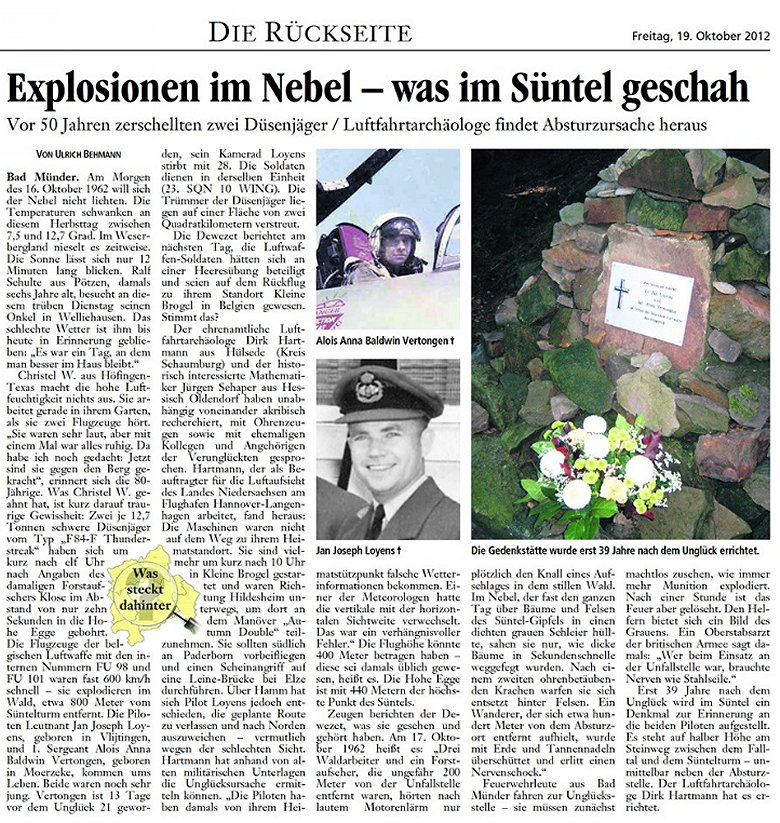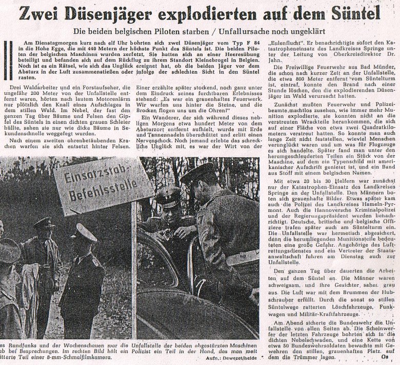 Christel W. aus Höfingen-Texas macht die hohe Luftfeuchtigkeit nichts aus. Sie arbeitet gerade in ihrem Garten, als sie zwei Flugzeuge hört. 'Sie waren sehr laut, aber mit einem Mal war alles ruhig. Da habe ich noch gedacht: Jetzt sind sie gegen den Berg gekracht', erinnert sich die 80-Jährige. Was Christel W. geahnt hat, ist kurz darauf traurige Gewissheit: Zwei je 12,7 Tonnen schwere Düsenjäger vom Typ 'F84-F Thunderstreak' haben sich um kurz nach elf Uhr nach Angaben des damaligen Forstaufsehers Klose im Abstand von nur zehn Sekunden in die Hohe Egge gebohrt. Die Flugzeuge der belgischen Luftwaffe mit den internen Nummern FU 98 und FU 101 waren fast 600 km/h schnell - sie explodieren im Wald, etwa 800 Meter vom Süntelturm entfernt. Die Piloten Leutnant Jan Joseph Loyens, geboren in Vlijtingen, und 1. Sergeant Alois Anna Baldwin Vertongen, geboren in Moerzeke, kommen ums Leben. Beide waren noch sehr jung. Vertongen ist 13 Tage vor dem Unglück 21 geworden, sein Kamerad Loyens stirbt mit 28. Die Soldaten dienen in derselben Einheit (23. SQN 10 WING). Die Trümmer der Düsenjäger liegen auf einer Fläche von zwei Quadratkilometern verstreut.