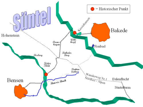 am Höhlenbach entlang der Straße folgt. Den Bach überquert man an der nächsten Brücke nach links. Der Weg führt in Richtung Dr.Scheibes Jagdhütte. Davor zweigt wiederum ein Weg nach rechts ab, der in den Rattenlöchern endet. Von dort aus geht es dann steil bergan und man erreicht den Wanderweg 1. Geht man nun direkt weiter in N-O-Richtung (leider durch Aufpflanzungen nicht mehr direkt möglich) erreicht man durch ein Tal parallel zu Steinernen Treppe das Fischertal oberhalb Bakede (Badeanstalt).