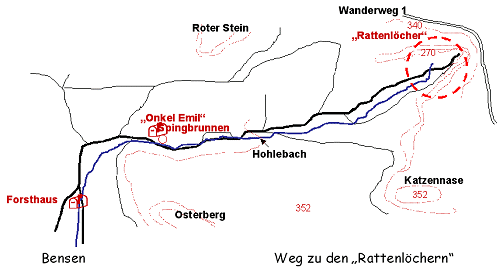 Die Rattenlöcher erreicht man, wenn man vorbei an 'Onkel Emils' ehemaliger Waldgaststätte (am Springbrunnen)