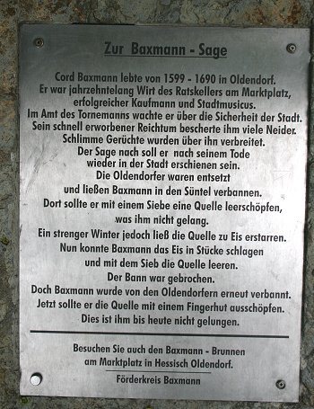 ihres Amtes walten. Jetzt nahmen sie Baxmann in die Mitte. Es gelang ihnen, den Wagen mit dem Gebannten durch das Hohensteintal und das Totental hinauf bis zur Quelle des Hollenbaches zu bringen. An diese Quelle, die man nach ihm Baxmannbrunnen nannte, wurde Baxmann gebannt. Er sollte erst erlöst sein, wenn er die Quelle mit einem Siebe leer geschöpft hatte. Die Oldendorfer glaubten, daß sie ihn für immer los wären. Aber dennoch sollte für Baxmann noch einmal die Erlösungsstunde schlagen.