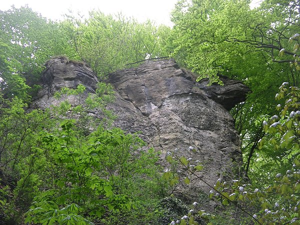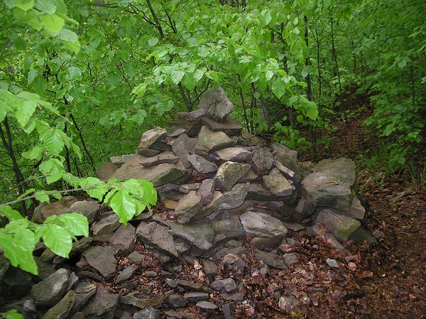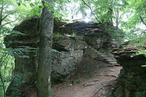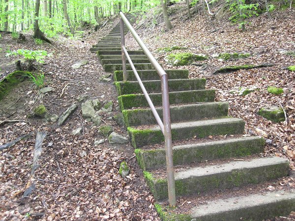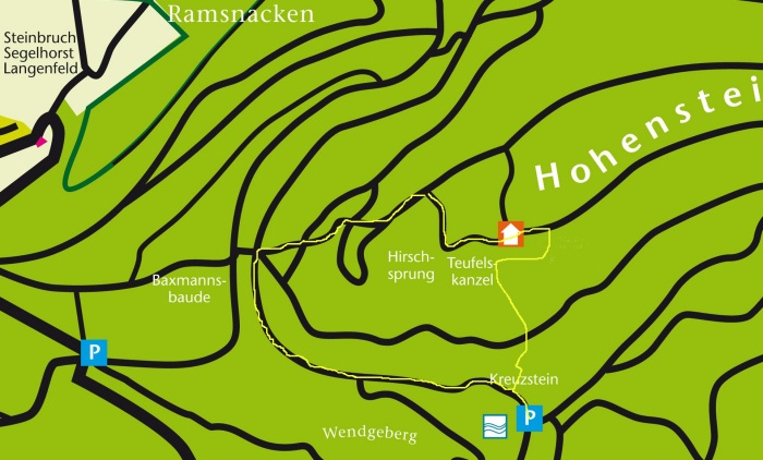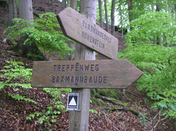 Die Wanderung beginnt am Parkplatz Kreuzstein. Zunächst geht für circa 150 Meter in Richtung Baxmannbaude. Dann geht ein kleiner Weg (gut zu erkennen, aber nicht ausgeschildert) nach rechts im rechten Winkel ab. Nach einigen Metern muss man sich halblinks halten. Der kleine, fast zugewachsene Weg führt gleich ziemlich steil bergan. Nach einiger Zeit erreicht man einen breiten Forstweg, der überquert werden muss. Jetzt wird der Weg noch steiler. An einer Steinpyramide (s. Foto) hat man die Wahl zwischen zwei Fortsetzungen. Ich empfehle den linken Weg. In jedem Fall erreicht man den Klippenweg. Hier muss man sich rechts halten und erreicht nach einiger Zeit den Kammweg. Von hier sind es nur noch 100 Meter nach links bis zum Grünen Altar. Zwischen dem Altar und der Schutzhütte geht es weiter Richtung Hirschsprung. Auf dem Plateau (mit dem großen Steintisch) beginnt der Treppenweg zur Baxmannbaude. Nach circa 300 Metern führt der Weg mal kurz nach links über eine Forstautobahn. Diese muss aber bald nach rechts verlassen werden. Die Ausschilderung ist in Ordnung. An der Baxmannbaude errreicht man das Blutbachtal. Hier führt die Asphaltstraße wieder zum Parkplatz zurück.