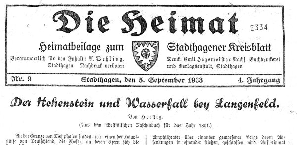 An der Grenze von Westphalen finden wir einen der Hauptflüsse von Deutschland, die Weser, an deren Ufern sich die Hauptstämme der uralten Deutschen ausbreiteten, die den Römer einst so furchtbar wurden und deren Nachkommen sich zu einem mächtigen Volke erhoben, welches in der Kulturgeschichte von Europa eine sehr bedeutende Rolle spielte. Hier an der Weser leben noch die unsterblichen Namen eines Hermann und eines Wittekind in den unzerstörbaren Denkmählern der Natur, die ihr Andenken der späteren Nachkommenschaft aufbewahren. Unter den Lippischen Bergen erhebt sich die Arminsburg ohnweit Pyrmont; und hier an unsferlangen Bergkette, die von der Weser gespalten wird, ragt der stolze Pfeiler der Westphälischen Pforte, der Wittekindsberg, majestätisch über die andern Berggipfel hervor, und beschaut mit unverwandten Blicken das große Schauspiel der Natur, den Strom der Weser, der die Berge von einander riß, um sich einen freyen Ausgang in den Ozean zu öffnen. Diese in der Geschichte der Völker so merkwürdige Gegend, die durch die großen Niederlagen der Römer und Franken noch berühmter geworden ist, zeichnet sich nicht weniger durch die vielen Merkwürdigkeiten der Natur vor allen andern Gegenden in Deutschland aus. Von diesen Merkwürdigkeiten, die ohnstreitig bekannter zu seyn verdienen, heben wir diesesmal nur zwey vor allen andern aus, den Wasserfall bey Langenfeld und den Hohenstein. Beide überraschen durch die große Wirkung, die ihr Anblick hervorbringt; beyde verdienten von jedem Freunde der Natur besucht zu werden, den der Zufall in unsere Nähe bringt.