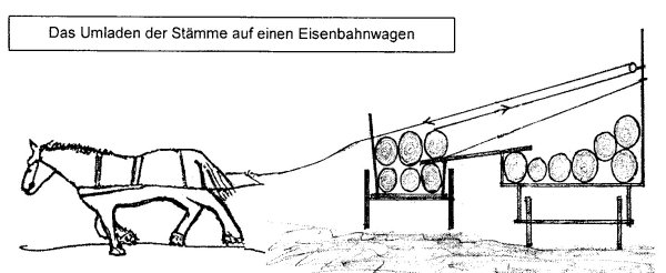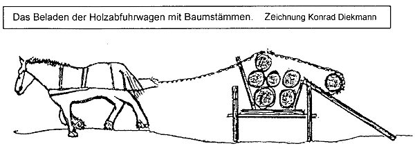 Die Arbeit des Holzfuhrmanns war teilweise von unbarmherziger Härte. An einem Arbeitstag unter 12 Stunden war nicht zu denken. Hauptsächlich wurden schwere Buchenstämme im Süntelwald abgefahren. Dazu dienten zweiachsige Holzwagen mit eisenbereiften Rädern, wie sie in der Landwirtschaft im Gebrauch waren. Diese wurden mit bis zu vier Festmetern (cbm) Holz beladen. Immerhin hatte dann so ein Wagen ein Gewicht von vier bis fünf Tonnen. Zum Aufladen der schweren Stämme gab es keine Geräte. An beide Wagenräder stellte man schräg auf Maß gekürzte Baumstämme, auf denen man die Stämme an den Enden mittels Ketten, die von je einem Pferd gezogen wurden, auf den Wagen rollte. Manchmal führte ein weiter und beschwerlicher Weg vom Süntelwald zum Abladesammelplatz oder zur Holzfabrik, zum Sägewerk, zum Bahnhof, wo die Umladung der Stämme auf Eisenbahnwagen erfolgte. Die Prozedur war ähnlich der des Aufladens im Walde. Die Stämme wurden von zwei Pferden mittels einer Umlenkrolle und Seilen direkt vom Fuhrwagen auf den Eisenbahnwagen gezogen oder besser gesagt gerollt.