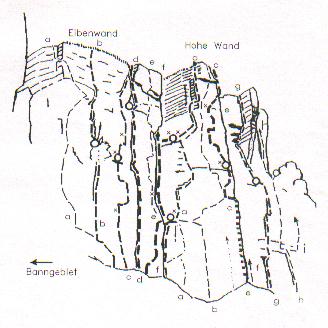 Die Eibenwand reicht von der Saugasse bis zum Eibenkamm. Von diesem Wandteil ab nach Osten ist das Klettern ausdrücklich freigegeben.