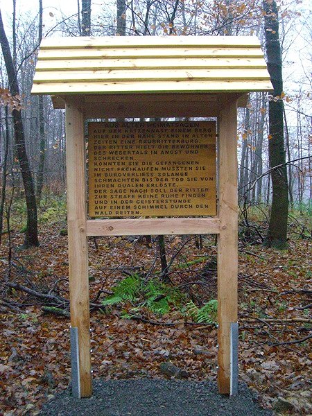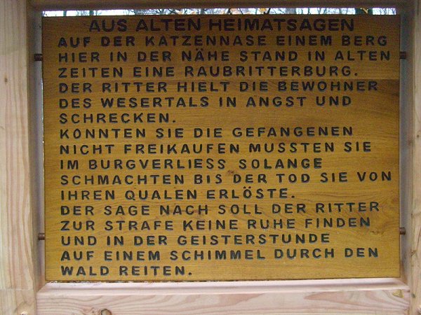 Auf der Katzennase stand in alten Zeiten eine Burg, in der ein böser Raubritter hauste. Durch seine Räubereien hielt er die Bewohner des ganzen Wesertals in Schrecken. Mit seinen Knechten fiel er über die Reisenden her, plünderte ihre Wagen aus und warf die Kaufleute in das dunkle Burgverlies. Konnten sie sich nicht durch hohes Lösegeld freikaufen, so mußten sie hier solange schmachten, bis der Tod sie von ihren Qualen erlöste. Eines Tages starb der Raubritter, und alle freuten sich, daß nun das böse Treiben des Unholds ein Ende hatte. Der Ritter mußte für seine Untaten schwere Strafen erleiden. Bis heute kann er im Grab keine Ruhe finden. In der Geisterstunde reitet er auf einem Schimmel durch den Wald, begleitet von einem großen Hund mit glühenden Augen. Regelmäßig kommt er auf seinem nächtlichen Ritt durch das Dorf Haddessen, das am Fuß der Katzennase liegt. Schon manchem ist die Gestalt um Mitternacht begegnet.