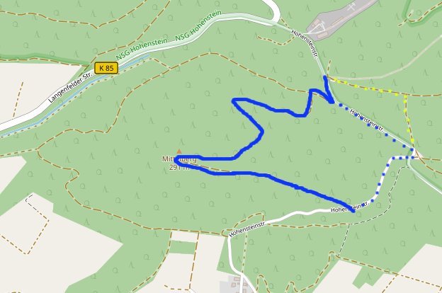 Zuerst geht man einige Meter auf der Asphaltstraße um dann nach rechts auf den Mittelberg abzubiegen. Achtung! Warnung! Es gibt hier eigentlich nichts besonderes zu sehen. Es gibt kaum mal eine schöne Aussicht, es gibt keinen Kiosk, ja nicht einmal Bänke!