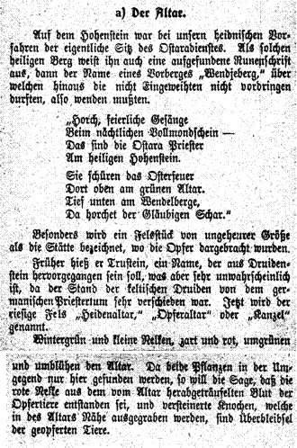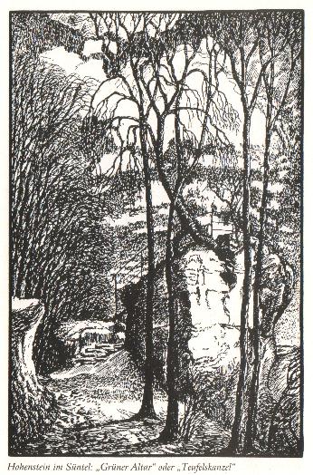 'Der Hohenstein gilt als alte germanische Kultstätte, die dem Gott Donar gewidmet war. Um diesen Berg und seine Felsvorsprünge Hirschsprung, Grüner Altar und Teufelskanzel ranken sich