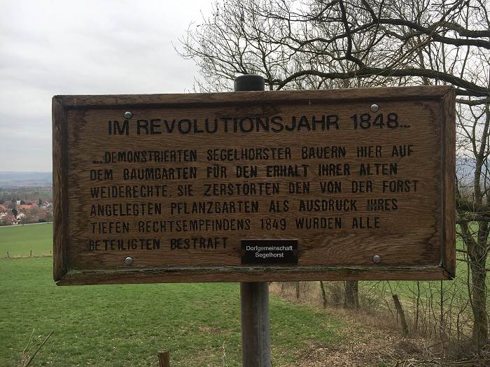 Die Dorfgemeinschaft Segelhorst hat am Fuße des Baumgartenbergs auf dem Rundwanderweg eine Erinnerungstafel an das Revolutionsjahr von 1848 nebst Ruhebank aufgestellt. Der Blick schweift von dort weit über das Tal.