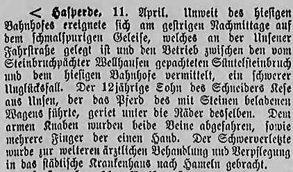 Der 12jährige Sohn des Schneiders Kese aus Unsen, der das Pferd des mit Steinen beladenen Wagens führte, geriet unter die Räder desselben. Dem armen Knaben wurden beide Beine abgefahren, sowie mehrere Finger der einen Hand. Der Schwerverletzte wurde zur weiteren ärztlichen Behandlung und Verpflegung in das städtische Krankenhaus nach Hameln gebracht.
