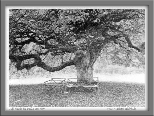 Auf der Waldhochebene des Süntels liegt nördlich gegenüber dem felsigen Hohensteingebiet das Dachtelfeld, jene einsame Waldgegend, auf der die Sachsen ein starkes Frankenheer Karls des Großen vernichtet haben sollen. Der Bach, der am Rande des Dachtelfeldes entspringt, heißt noch jetzt der Blutbach, und das Tal, das er durchfließt, das Totental. In den Steilwänden und Felskanzeln, die von dem Muschelkalkplateau steil in die Waldschluchten stürzen, wächst die dunkle Eibe, die Felsenbirne, die Mispel und auf Fels- und Waldboden manches andere seltene Kraut. Der ganze Waldbezirk dieser kraftvollen niedersächsischen Felslandschaft steht darum unter Naturschutz. Die Süntelbuchen - es gibt auf dem Dachtelfelde noch ein gutes halbes Dutzend davon - sind in die einsamen Waldgegenden zurückgewichen. Die vollkommendste ihrer Art wächst dicht an der Grenze von Wald und Feld nahe dem abseitigen Dörfchen Rahden.