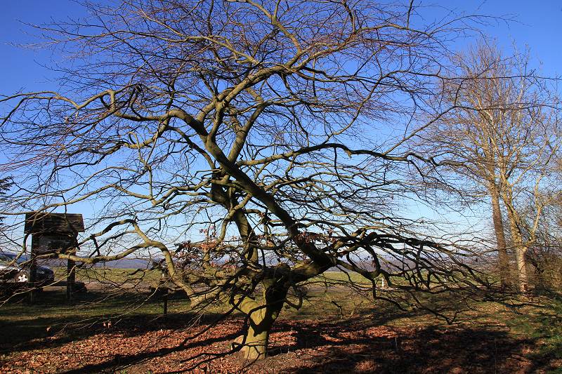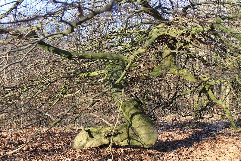 Sehr interessant war der Hinweis des Einheimischen auf den einzigen Ableger der Tilly-Buche. Man kann ihn leicht übersehen. Wenn man auf der Bank sitzt, dann findet man schräg rechts dahinter eine mittlerweile auch schon ziemlich große, wunderschöne Süntelbuche!