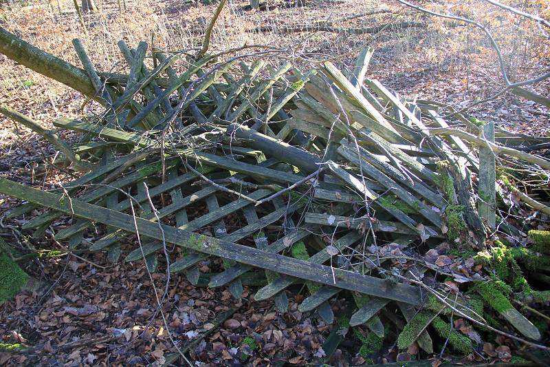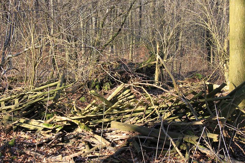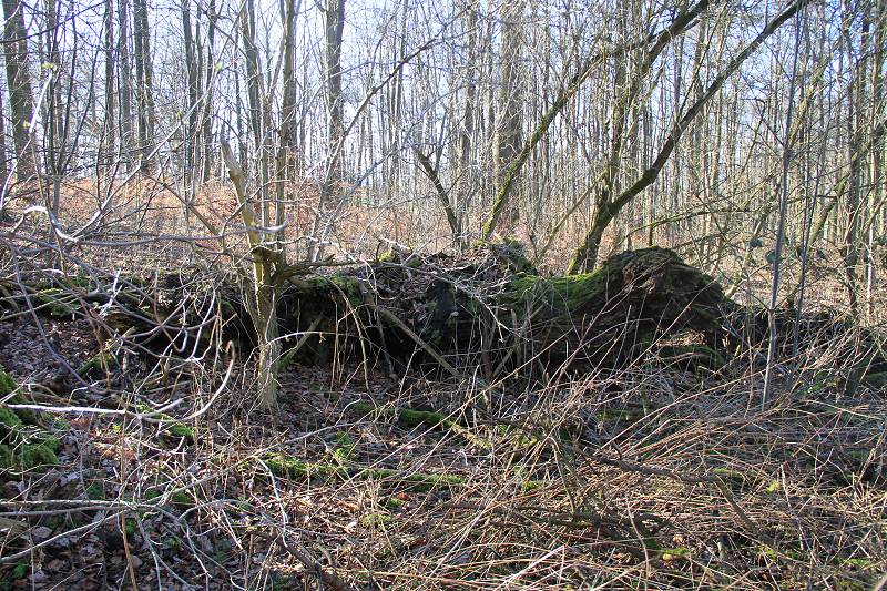 Vor Ort haben wir eine beschriebene Bank schnell gefunden. Und von der Tilly-Buche davor ist noch wesentlich mehr zu sehen, als ich erwartet habe. Reste des Stammes liegen deutlich erkennbar auf dem Boden. Zusammen mit den Resten des alten Zaunes ergibt das Ganze ein ziemliches Chaos.