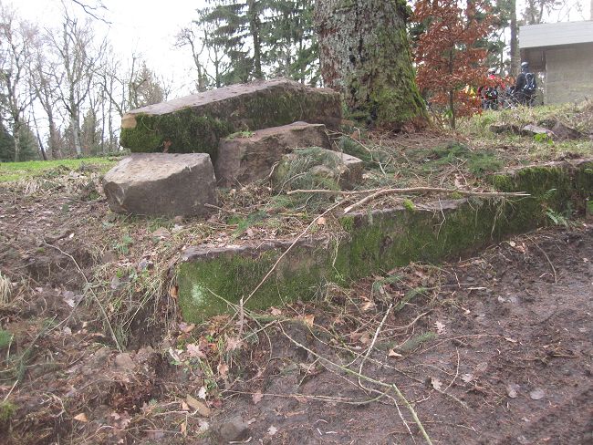 Ein Forstfahrzeug hatte einen Baum so ungeschickt vom Jahnhütten-Vorplatz gezogen, dass ein Stück der alten Abmauerung des Geländes zerstört wurde. 93 Jahren lagen diese Steine dort. Wird das repariert?