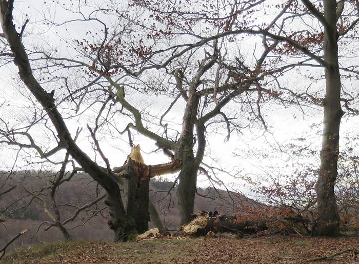 Dort oben hat es am vorletzten Wochenende einige cm sehr nassen Schnee gegeben, und es befand sich noch reichlich Laub auf den Bäumen. An dem betreffenden Freitag war ich mit dem Hund im Süntel oberhalb Bakede unterwegs, dort lagen am Nachmittag an einigen Stellen noch 5-10cm Schnee. Da hat es nicht mehr viel Wind benötigt, um reihenweise Äste abbrechen zu lassen. Und am Samstag und Sonntag hatten wir ja reichlich davon aus südlichen Richtungen, dem war der alte Baum an der Schönen Aussicht schutzlos ausgeliefert. Selbst bei uns im Tal konnte man außer Astbruch auch reihenweise Büsche und Sträucher sehen, die unter der Last nachgegeben haben. M.D.