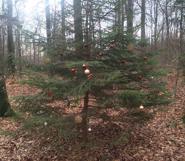 Er steht an der Asphaltstraße von der Bergschmiede zur Eulenflucht, ca. 75 m nach der Schranke, links 10 m von der Straße entfernt. Die roten Kugeln hängen seit Jahren. Die goldenen Kugeln sind neu. Foto: Thomas Grahl