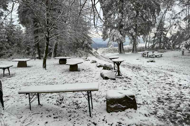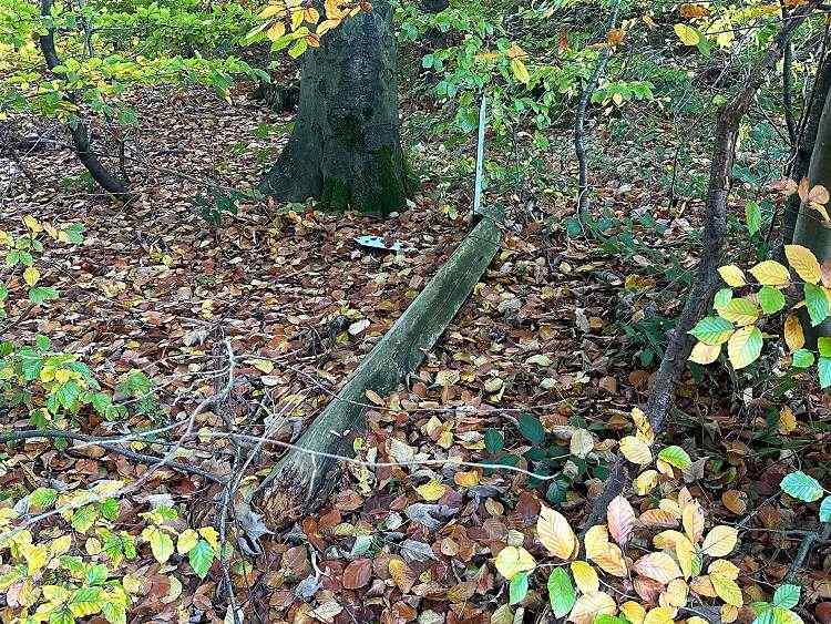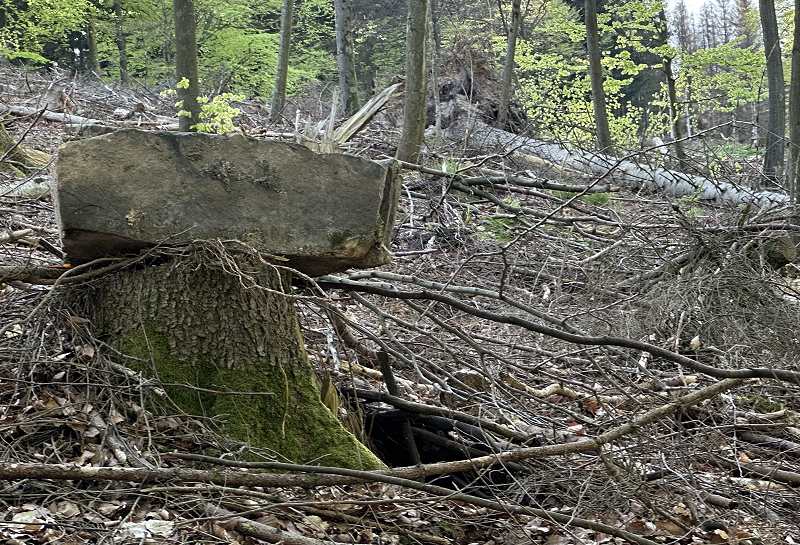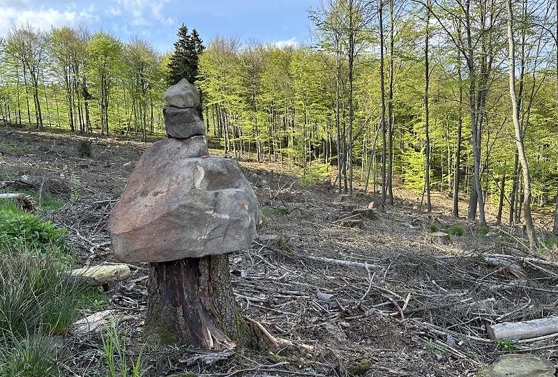 Zwischen Süntelturm und Steinbachtal haben Waldarbeiter sich einen Scherz erlaubt und Baumstümpfe mit großen Steinen bedeckt.