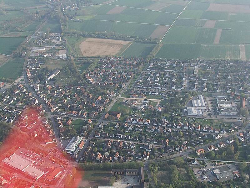 Am unteren Bildrand sieht man den Verlauf der Süntelstraße und die Zufahrten zu Fa. Kreibaum (heute ALDI und Vital).