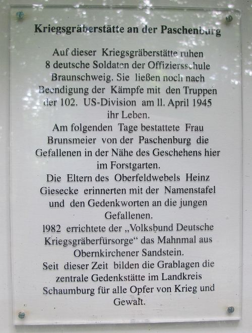 Nahe der Paschenburg befindet sich eine Kriegsgräberstätte. Auf ihr sind acht deutsche Soldaten bestattet, die als Angehörige der Offiziersschule Braunschweig gegen Ende des Zweiten Weltkriegs nahe der Paschenburg am 11. April 1945 beim Kampf gegen anrückende amerikanische Truppen fielen.