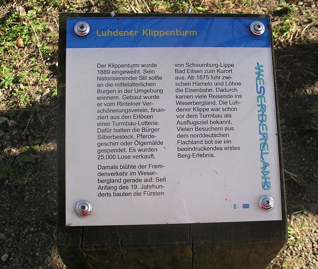 Erbaut wurde der zur Stadt Rinteln gehörige Turm 1889 durch den Rintelner Verschönerungsverein aus vor Ort gebrochenem Stein der Luhdener Klippen. Die Finanzierung erfolgte durch eine Turmbau-Lotterie. Der Luhdener Klippenberg kann unter anderem von Rinteln und Luhden aus erwandert werden. Die Aussichtsplattform des Turmes ist über 103 Stufen im Turm zu erreichen. Vom Klippenturm aus bietet sich bei guter Sicht ein Überblick in die Norddeutsche Tiefebene sowie über das westliche Weserbergland. Am Fuß des Turmes befindet sich eine ganzjährig bewirtschaftete Gaststätte. Quelle: wikipedia