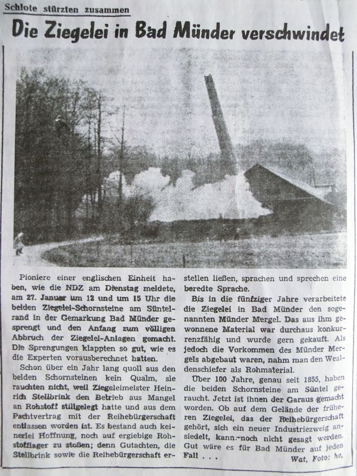 Die Ziegelei am Süntel ist ca. 1855 errichtet worden. Der Ton stammte ursprünglich aus einer Grube am Süntelrand in Richtung Hamelspringe, Pferdefuhrwerke brachten ihn über die Gleise einer Feldbahn heran. In den 40er Jahren des letzten Jahrhunderts wurde ein neuer Pachtvertrag zwischen der Ziegelei und der Reihebürgerschaft Bad Münder zum Tonabbau im Süntel geschlossen. Den Ton gewann man seitdem in einer Grube unterhalb der Bergschmiede. Der Betreiber der Ziegelei, H. Stellbrink, führte die Firma bis 1962. Er wies gegenüber der Reihebürgerschaft durch ein geologisches Gutachten nach, dass zu diesem Zeitpunkt das Tonlager erschöpft war, der Pachtvertrag konnte aufgehoben werden. 1964 wurde der einst qualmende Schornstein mit Hilfe einer britischen Pioniereinheit gesprengt.