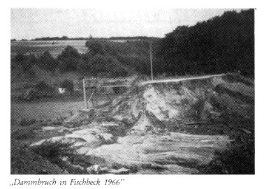 Die größte Flutkatastrophe erlebten die Sünteldörfer - und vor allem Fischbeck - am 19. Juli 1966. In breiter Front hielten mehrere Gewitter von Bensen bis Pötzen vor dem Süntel. Gegen 17 Uhr setzte plötzlich strömender Regen ein, als hätte der Himmel alle Schleusen geöffnet. In der kurzen Zeit von 2 Stunden fiel eine Niederschlagsmenge von 80 mm, das sind 4/5 hl = 80 Liter auf einen Quadratmeter. Die Wassermassen schossen von den Hängen des Süntels zu Tal, füllten die Bäche und Mulden und strömten durch Gärten und Häuser, alles mitreißend, in gewaltigen Wogensprüngen auf Höfingen zu und füllten in kurzer Zeit das Rückhaltebecken der Talsperre oberhalb Fischbecks mit seinem Fassungsvermögen von 164.000 m³. Wieder wurden die Häuser und Hofstellen, die dicht am Bach lagen, am schwersten betroffen. Die Wassermassen drückten die Schutzmauer des Hofes Nr. 2 in einer Länge von 20 Metern ein, und das Wasser überflutete in rasendem Lauf sämtliche Ställe, die Scheune und das neue, unterkellerte Wohnhaus. In den Kellern stand das Wasser 1,70 m hoch, in den Ställen 1 m. Das Vieh stand ruhig im Wasser, es war ja warm. Der Regen hatte längst aufgehört, aber man konnte nichts unternehmen, denn das Wasser staute von der Talsperre bis in unser Dorf. Höfingen lag da wie in einem See. Wir glaubten uns stark betroffen und Fischbeck geschützt.